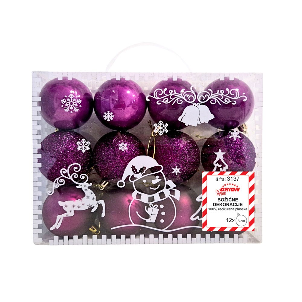 Božične kroglice plastične 6cm/12kom kovček, vijolične