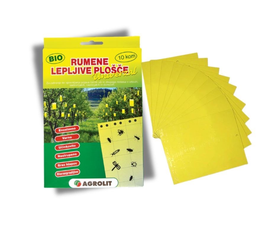 Rumene lepljive plošče univerzal so preprosta in učinkovita rešitev za zatiranje in spremljanje različnih škodljivcev, ki se pojavljajo na vrtu, sadovnjaku, v rastlinjakih ali okoli lončnic. Rumena barva privablja leteče in plazeče insekte, ki se prilepijo na lepljivo površino in tako ne morejo več povzročati škode rastlinam.