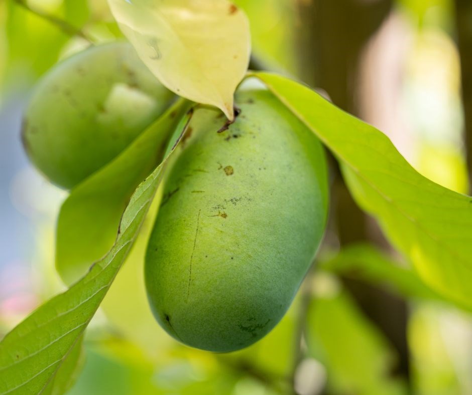 Asimina triloba je listnati trajnica/majhno drevo iz Severne Amerike, ki lahko zraste več metrov visoko in tvori bogato krošnjo s temno zelenimi listi in značilnimi temno rdečimi cvetovi spomladi. Plodovi zrejo pozno poleti ali zgodaj jeseni in so ovalne, zelene do rumeno-rjave barve, s sladko, kremasto notranjostjo, polno arom in brez izrazitih ostrih not.