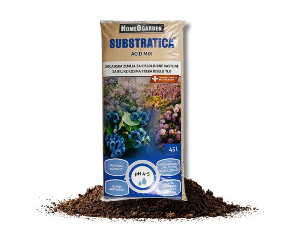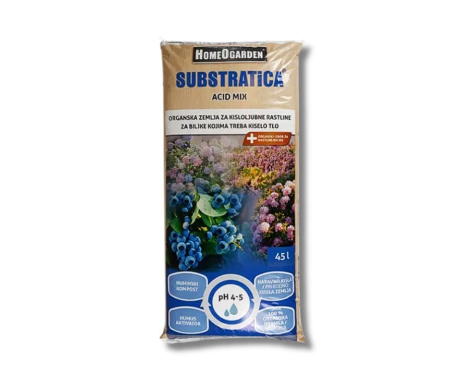 • Zemlja za borovnice Substratica Acid Mix združuje hranilne naravne sestavine, ki ohranjajo izbrane kisloljubne rastline zdrave in spodbujajo njihovo rast. Za dodatno spodbudo in oporo pri začetni rasti borovnic, je mešanici dodano še kislo organsko  gnojilo.